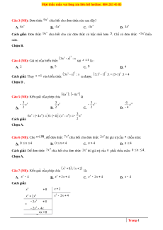 ệ otline: 084 283 45 85 Câu 3 (NB): Đ n t ơ hức 3 9x chia h t ế cho đ n t ơ hức nào sau đây? A. 5 6x B. 2 -5x C. 4 -3x D. 6 3x Cách gi i ả : Đ n ơ th c ứ 3 9x chia h t ế cho các đ n ơ th c ứ có b c ậ nhỏ h n ơ 3. Chỉ có đ n ơ th c ứ 2 5x thỏa mãn. Ch n ọ B. x x x Câu 4 (NB): Giá tr c ị ủa bi u t ể hứ 2 2 3 - : c tại x 1 là : A. 2 B. 5 C. 9 D. 4 x x x Cách gi i ả : Thay x 1 vào bi u t ể h c ứ 2 2 3 - : ta đượ 2 2 2 3.1 1 :1 = (3-1) :1 = 4 c: Ch n ọ D . 7 x 4 6 : 4x