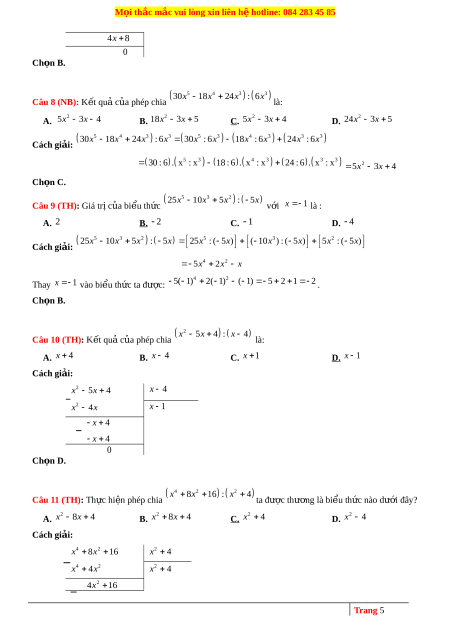 x 8 : x 2 Câu 7: Kết quả c a ủ phép chia là: A. 2 x 4 B. 2 x 2x 4 C. 2 x 2x 4 D. x 4 5 4 3 3