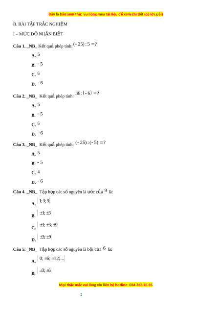 Câu 3. _NB_ Kết quả phép tính: ( 25) : ( 5) ? A. 5 B. 5 C. 4 D. 6
