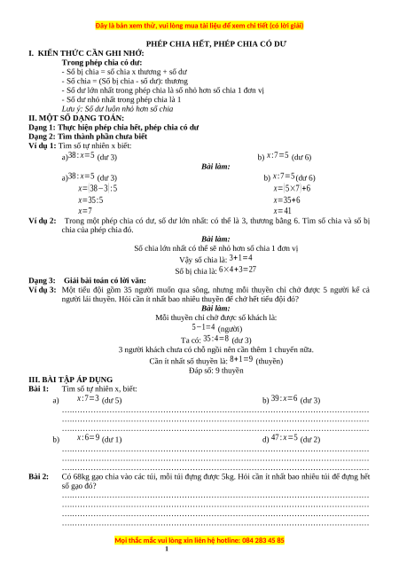 Dạng 1: Thực hiện phép chia hết, phép chia có dư