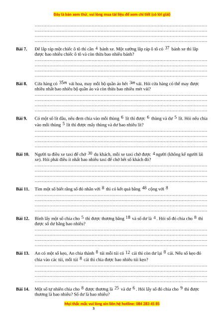 Bài 3. Trong một phép chia có dư, số dư lớn nhất có thể là , thương bằng . Tìm số chia và số bị