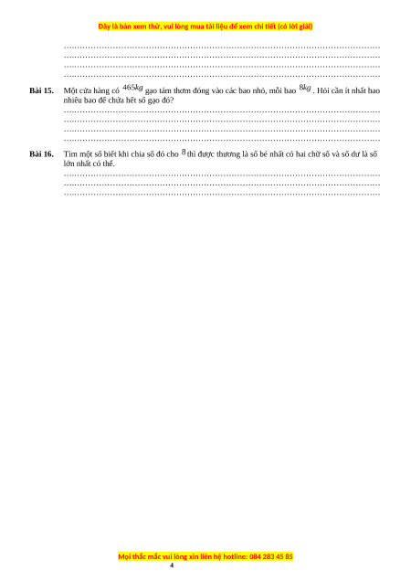 Bài 4. Trong một phép chia có dư, số dư lớn nhất có thể là , thương bằng . Tìm số chia và số bị