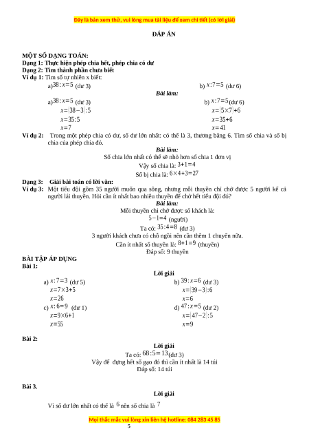 Bài 5. Trong phép chia có dư, số chia bằng , thương bằng và số dư là số dư lớn nhất có thể. Tìm
