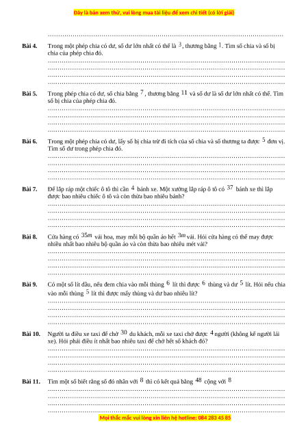 Bài 3. Trong một phép chia có dư, số dư lớn nhất có thể là , thương bằng . Tìm số chia và số bị