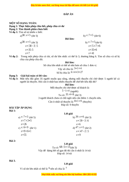 Dạng 1: Thực hiện phép chia hết, phép chia có dư