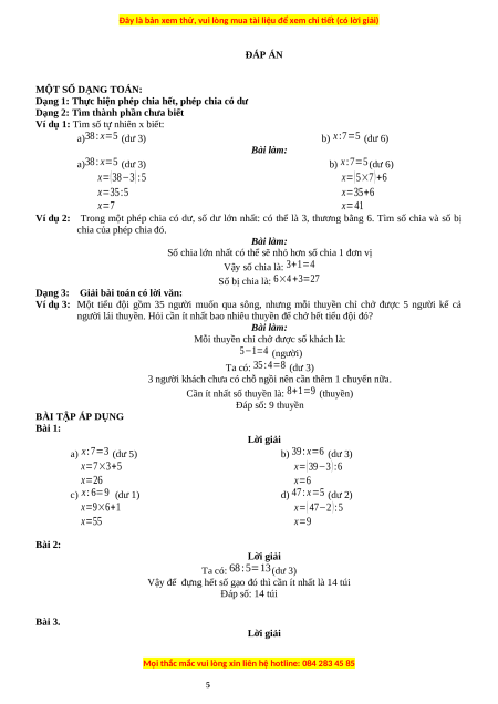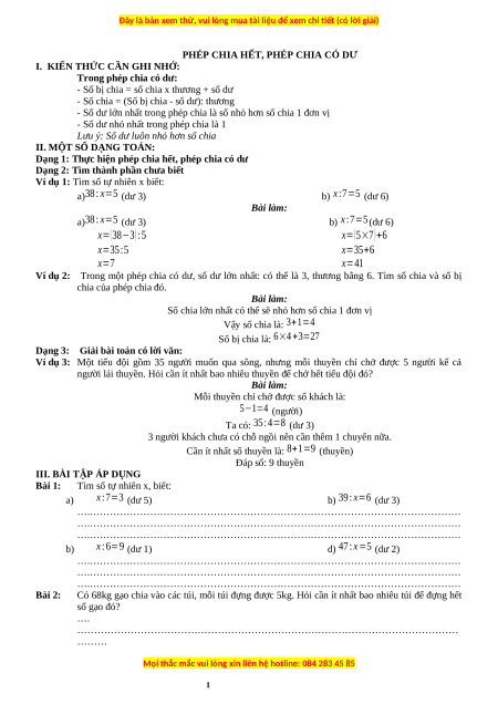 Dạng 1: Thực hiện phép chia hết, phép chia có dư