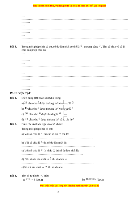 …………………………………………………………………… e) Số dư lớn nhất là thì số chia là:
