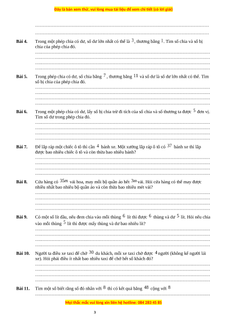 Bài 3. Trong một phép chia có dư, số dư lớn nhất có thể là , thương bằng . Tìm số chia và số bị