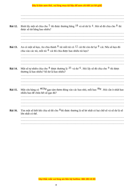 Bài 4. Trong một phép chia có dư, số dư lớn nhất có thể là , thương bằng . Tìm số chia và số bị