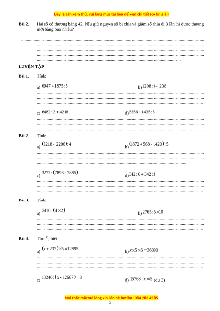Bài 2. Hai số có thương bằng 42. Nếu giữ nguyên số bị chia và giảm số chia đi 3 lần thì được thương