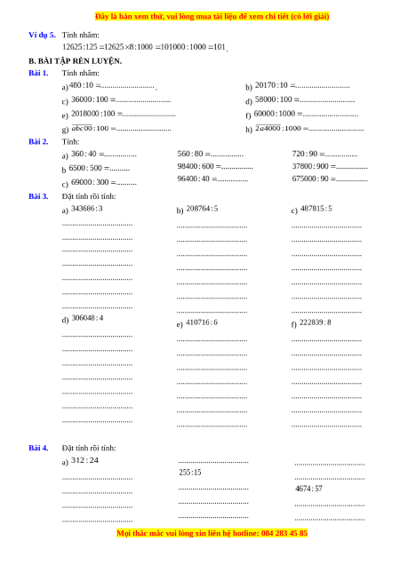 Ví dụ 5. Tính nhẩm: . B. BÀI TẬP RÈN LUYỆN. Bài 1. Tính nhẩm: a) . b) c) d) e) f) g) h) Bài 2. Tính: a) b c) Bài 3. Đặt tính rồi tính: a) b) c)