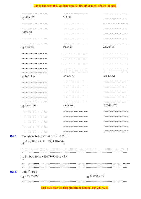 Chuyên đề Phép chia Toán lớp 4 nâng cao