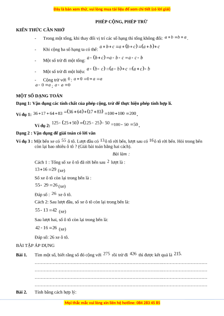 Sau lượt hai, số ô tô còn lại trong bến là: (xe) Đáp số: 26 xe ô tô. BÀI TẬP ÁP DỤNG Bài 1.