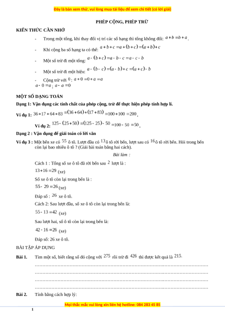 Dạng 1: Vận dụng các tính chất của phép cộng, trừ để thực hiện phép tính hợp lí. Ví dụ 1: . Ví dụ 2: .
