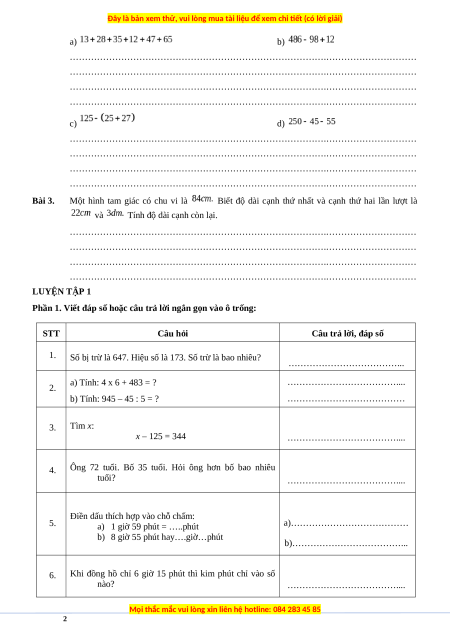 Phần 1. Viết đáp số hoặc câu trả lời ngắn gọn vào ô trống: STT Câu hỏi