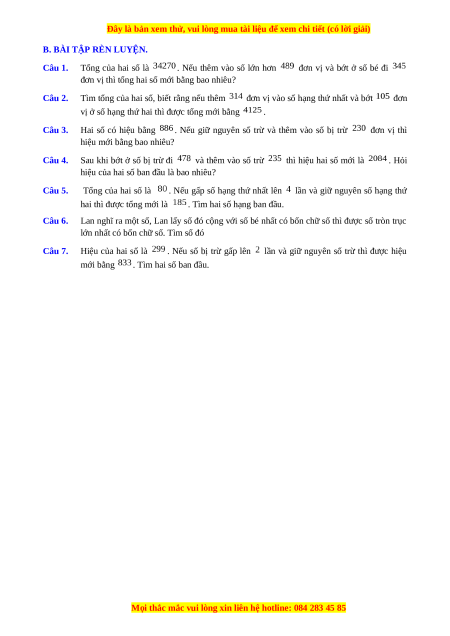 Câu 4. Sau khi bớt ở số bị trừ đi và thêm vào số trừ thì hiệu hai số mới là . Hỏi