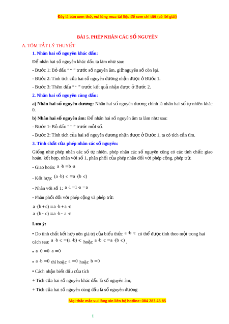 BÀI 5. PHÉP NHÂN CÁC S N Ố GUYÊN A. TÓM T T Ắ LÝ THUY T Ế 1. Nhân hai s n ố guyên khác d u ấ : Để nhân hai s nguyê ố