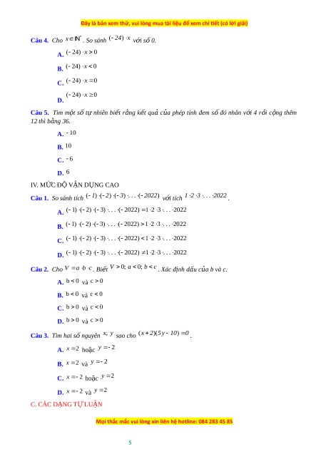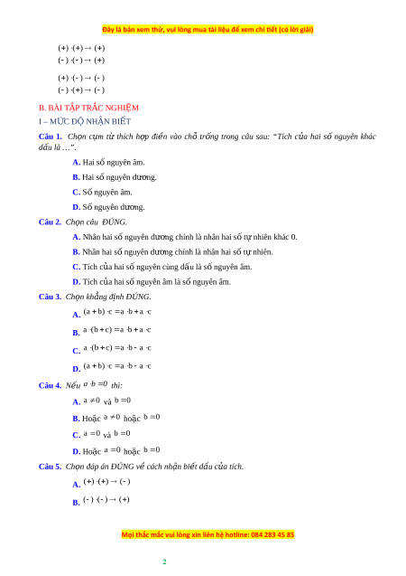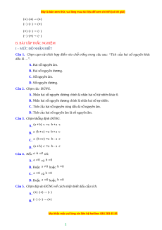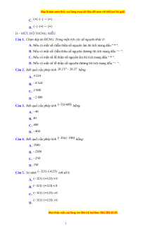 ủ hai số nguyên khác dấu là …”. A. Hai s nguyê ố n âm. B. Hai s nguyê ố n dư ng. ơ C. S nguyê ố n âm. D. S nguyê ố n dư ng. ơ Câu 2. Ch n c ọ âu ĐÚNG. A. Nhân hai s nguyê ố n dư ng c ơ hính là nhân hai s t ố ự nhiên khác 0. B. Nhân hai s nguyê ố n dư ng ơ chính là nhân hai s t ố nhi ự ên. C. Tích c a ủ hai s nguyê ố n cùng dấu là s nguyê ố n âm. D. Tích c a ủ hai s nguyê ố n âm là s nguyê ố n âm. Câu 3. Ch n k ọ hẳng đ nh Đ ị ÚNG. A. (a b) c a b a c B. a ( b c) a b a c C. a ( b c) a b a c D. (a b) c a b a c