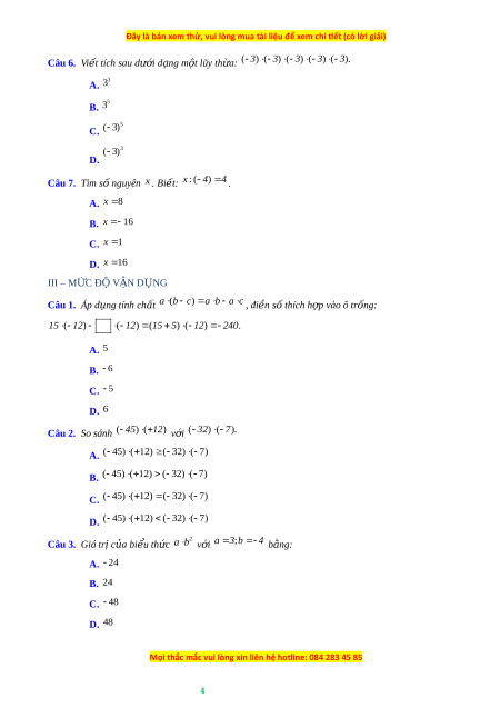 ên x . Biết: x : ( 4) 4 . A. x 8 B. x 16 C. x 1 D. x 1 6 III – M C Đ Ứ Ộ V N Ậ D N Ụ G