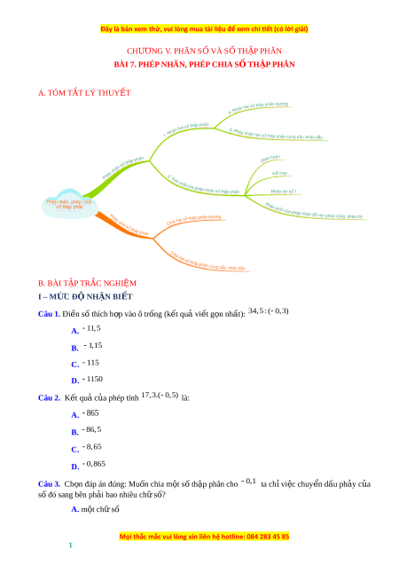 BÀI 7. PHÉP NHÂN, PHÉP CHIA S Ố TH P Ậ PHÂN A. TÓM T T Ắ LÝ THUY T Ế B. BÀI T P Ậ TR C N Ắ GHI M Ệ I – MỨC ĐỘ NH N Ậ BI T Ế Câu 1. Đi n s ề t ố hích h p và ợ o ô tr ng ố (k t ế quả vi t ế g n nh ọ ất): 34,5 : ( 0,3) A. 11,5 B. 1,15 C. 115 D. 1150