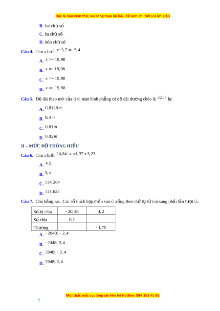 Câu 6. Tìm x biết 24,84 : x 1 , 37 3, 23 A. 4,5 B. 5, 4 C. 114, 264 D. 114,624