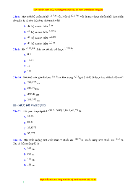 ỏ trong 4,75 giờ ô tô đó đi đư c ợ bao nhiêu ki-lô-mét? A. 248,125 km B. 248, 75 km C. 249, 25 km D. 249,375 km III – MỨC ĐỘ V N Ậ D N Ụ G