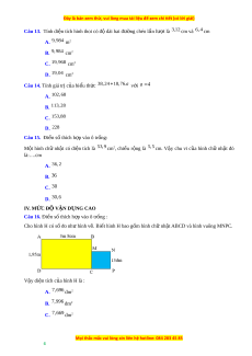 ộ là 5,5 cm. Vậy chu vi c a ủ hình chữ nh t ậ đó là:….cm A. 36, 2 B. 36 C. 30 D. 30,6 IV. MỨC ĐỘ V N Ậ D N Ụ G CAO Câu 16. Đi n s ề t ố hích h p và ợ o ô tr ng ố : Cho hình H có s đo nh ố hì ư nh v . Bi ẽ t ế hình H bao g m ồ hình ch nh ữ t