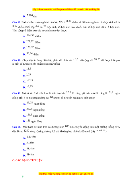 ủ phép tính (31,5 5,85) :1,8 2, 4.1,75 là: A. 18, 45 B. 18, 27 C. 29,1375 D. 35,375 Câu 12. M t ộ th a ử ru ng ộ hình chữ nh t ậ có chi u ề dài 48,75 m, chi u ề r ng ộ kém chi u ề dài 13,5 m. Chu vi th a ử ru ng ộ đó là: A. 167 m B. 168 m C. 186 m D. 156 m