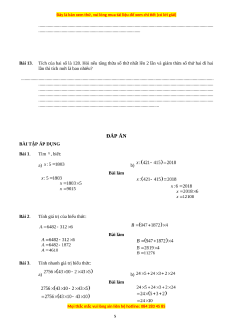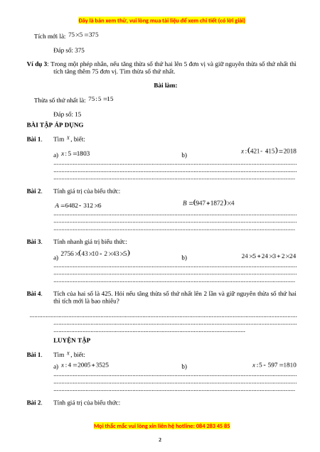 tích tăng thêm 75 đơn vị. Tìm thừa số thứ nhất. Bài làm: Thừa số thứ nhất là: Đáp số: 15 BÀI TẬP ÁP DỤNG Bài 1. Tìm , biết: a) b)