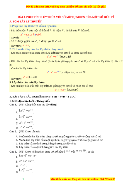 BÀI 3. PHÉP TÍNH LŨY TH A Ừ V I Ớ S M Ố Ũ T N Ự HIÊN C A Ủ M T Ộ S H Ố U Ữ TỈ A. TÓM T T Ắ LÝ THUY T Ế