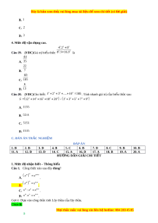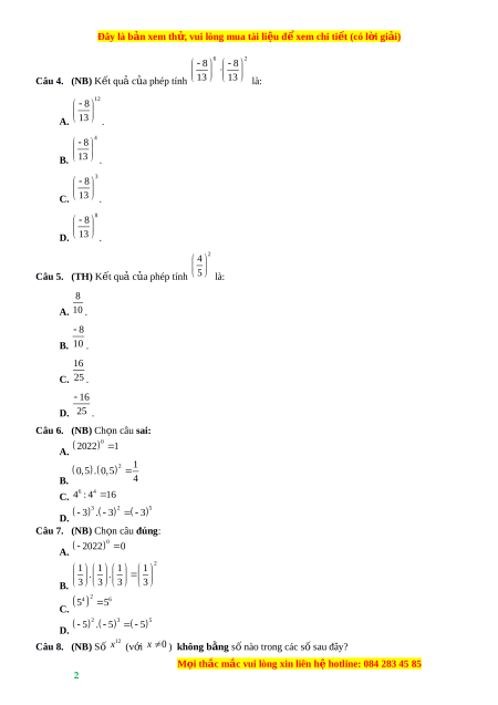 Câu 5. (TH) Kết quả c a ủ phép tính 5 là: 8 A. 10 . 8 B. 10 . 16 C. 25 . 16 D. 25 . Câu 6. (NB) Ch n ọ câu sai: A. 0 2022 1 2 1 0,5 . 0,5 B. 4 C. 6 4 4 : 4 1 6 3 2 5 3 . 3 3 D. Câu 7. (NB) Ch n ọ câu đúng: A. 0 2022 0 2 1 1 1 1 . .