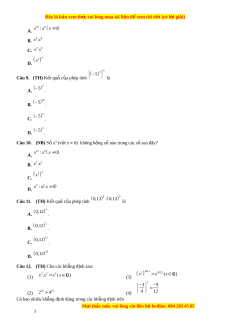 Câu 1. (NB) Công thức nào sau đây đúng? n m m n x x A. . n m m. n x x B. . C. m n : : m n x x x . D. m n m. . n x x x . Câu 2. (NB) Ch n ọ câu sai: A. Mu n nhâ ố n hai lũy th a ừ cùng c s ơ , t ố a gi nguyê ữ n c s ơ và ố c ng ộ hai s m ố ũ B. Mu n ố tính lũy th a ừ c a ủ m t ộ lũy th a ừ , ta gi nguyê ữ n c s ơ và ố c ng ha ộ i s m ố ũ C. Lũy th a ừ của một thư ng ơ bằng thư ng c ơ ác lũy th a ừ D. Lũy th a