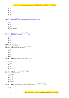 Đây là bản xem th , vu ử i lòng mua tài li u ệ đ xe ể m chi ti t ế (có l i ờ gi i ả ) A. 1. B. 2 . C. 3 . D. 4 . Câu 13. (TH ) S ố 24 2 viết dư i ớ dạng lũy th a ừ có s m ố ũ 8 là: 8 A. 8 8 B. 9 8 C. 6 D. Đáp án khác. x 5 2 2 2 Câu 14. (TH ) S ố x s ao cho l à : A. 5 B. 7 C. 27 D. 10 3. Mức độ v n ậ d n ụ g Câu 15. (VD) Ch n ọ đáp án đúng: 2 1 0 2 2 2 A. 3 . B. 1. C. 4 . D. 2 .