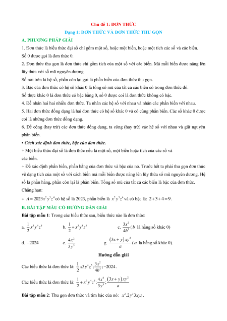 Dạng 1: ĐƠN THỨC VÀ ĐƠN THỨC THU GỌN