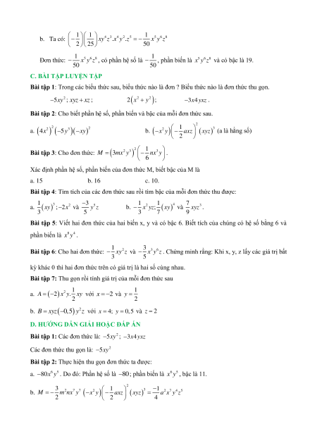 Vậy đơn thức có hệ số bằng a, phần biến là 6 4 x y , bậc là 10. 1 1 1 b. Ta có: 4 3 4 2 5 5 6 8