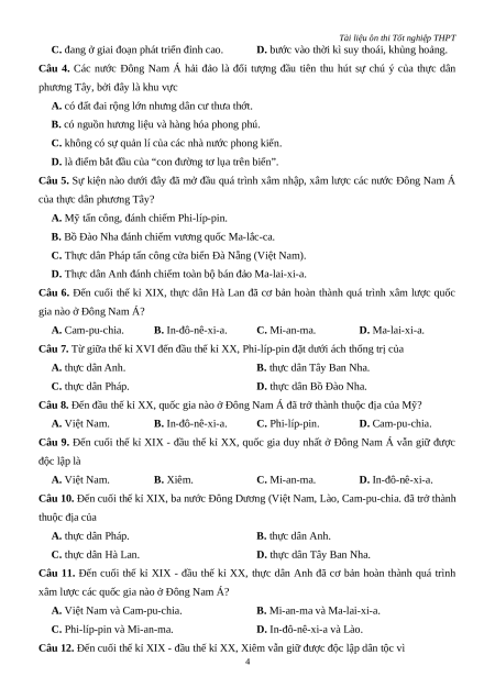 Câu 9. Đến cuối thế kỉ XIX - đầu thế kỉ XX, quốc gia duy nhất ở Đông Nam Á vẫn giữ được độc lập là A. Việt Nam. B. Xiêm. C. Mi-an-ma. D. In-đô-nê-xi-a.