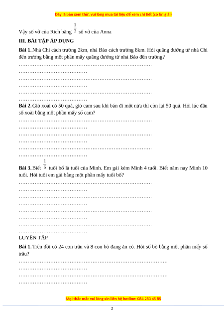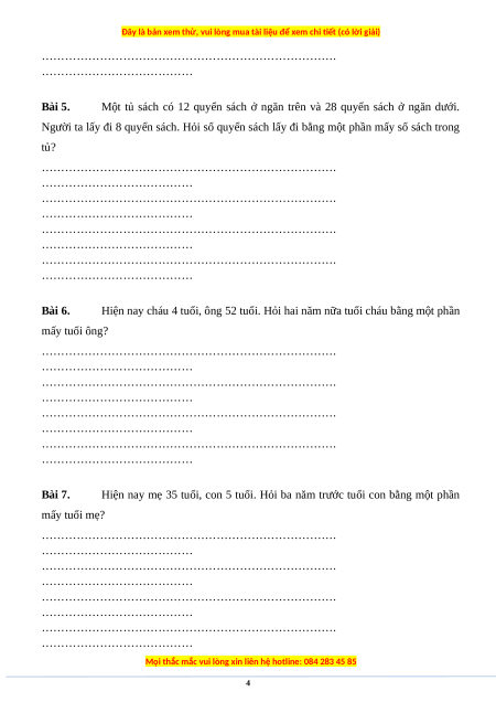 Bài 7. Hiện nay mẹ 35 tuổi, con 5 tuổi. Hỏi ba năm trước tuổi con bằng một phần