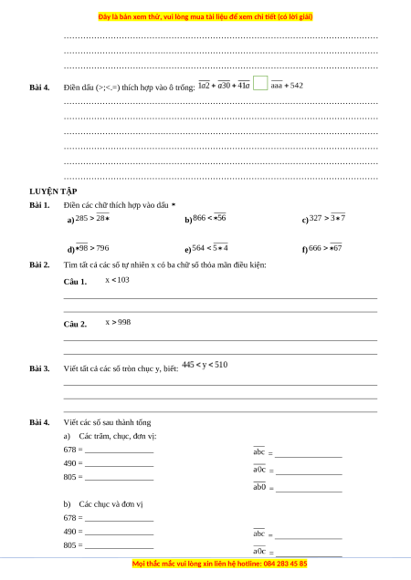 a) Các trăm, chục, đơn vị: 678 = _________________ = _________________ 490 = _________________ = _________________ 805 = _________________ = _________________ b) Các chục và đơn vị 678 = _________________ 490 = _________________ = _________________ 805 = _________________ = _________________