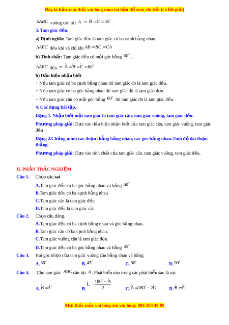ủ tam giác cân, tam giác vuông, tam giác đ u. ề II. PH N Ầ TR C Ắ NGHI M Ệ Câu 1. Ch n c ọ âu sai A.Tam giác đ u c ề