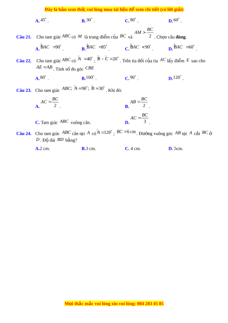 Câu 20. Cho tam giác ABC có M là trung đi m ể c a ủ BC và 2 . S đo góc ố BAC là M i