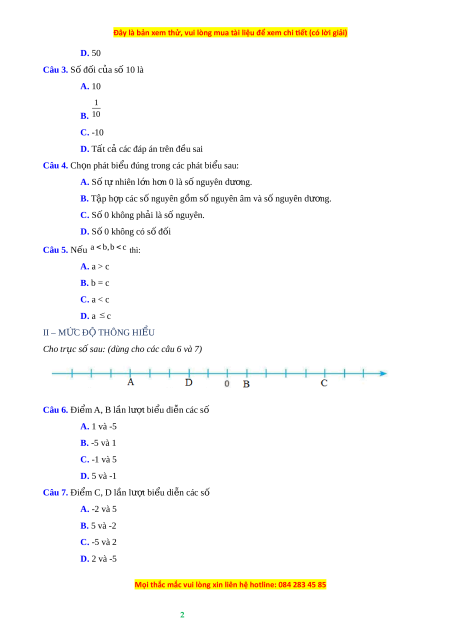 Câu 4. Ch n phá ọ t bi u đúng t ể rong các phát bi u ể sau: A. S t ố ự nhiên l n ớ h n 0 l ơ à s nguyê ố n dư ng. ơ B. Tập h p c ợ ác s nguyê ố n gồm s nguyê ố n âm và s nguyê ố n dư ng. ơ C. S 0 không ph ố ải là số nguyên. D. S 0 không c ố ó s đ ố ối