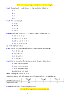 Câu 8. Cho tập h p ợ D = {x Z ϵ | 3 ≥ x ≥ -1}. T p h ậ p D ợ có s ph ố n t ầ l ử à: A. 3 B. 4 C. 5 D. 6