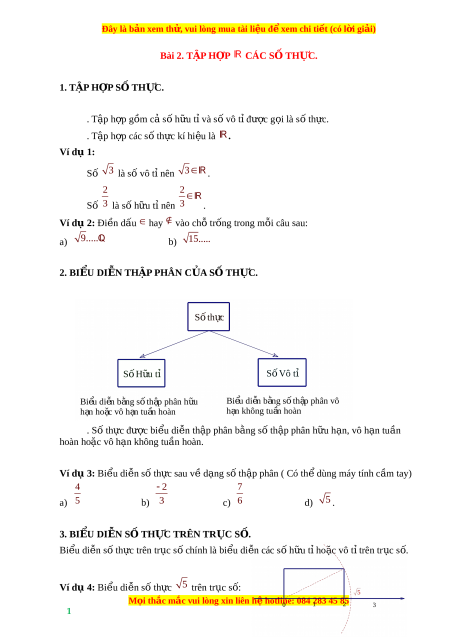 Ợ CÁC SỐ TH C Ự . 1. T P Ậ H P Ợ S Ố TH C. Ự . Tập h p ợ gồm cả s ố h u ữ t ỉvà s ố vô t ỉđư c ợ g i ọ là s ố th c ự . . Tập h p ợ các s ố th c ự kí hi u ệ là . Ví dụ 1: Số 3 là s ố vô t ỉnên 3 . 2 2 Số 3 là s ố h u ữ t ỉnên 3 . Ví dụ 2: Đi n ề d u ấ hay vào ch ỗ tr ng ố trong m i ỗ câu sau: a) 9..... b) 15..... 2. BI U Ể DI N Ễ TH P Ậ PHÂN C A Ủ S Ố TH C Ự . . Số thực đư c ợ bi u ể di n ễ thập phân b ng ằ s ố th p ậ phân h u ữ h n, ạ vô h n ạ tu n ầ hoàn hoặc vô h n ạ không tu n ầ hoàn. Ví dụ 3: Bi u ể di n ễ s ố th c ự sau v ề d ng ạ s ố th p ậ phân ( Có th ể dùng máy tính c m ầ tay) 4 2 7 a) 5 b) 3 c) 6 d) 5 . 3. BI U Ể DI N Ễ S Ố TH C Ự TRÊN TR C Ụ S . Ố Bi u ể di n ễ số th c ự trên tr c ụ s ố chính là bi u ể di n ễ các s ố h u ữ t ỉho c ặ vô t ỉtrên tr c ụ s . ố Ví dụ 4: Bi u ể di n ễ s ố th c ự 5 trên tr c ụ s : ố M i ọ thắc m c