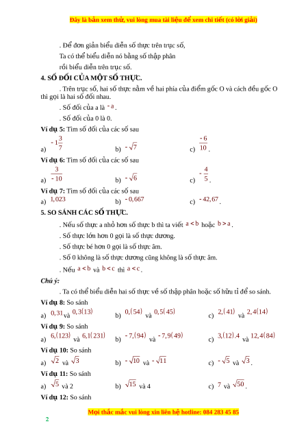 Đây là bản xem th , vu ử i lòng mua tài li u ệ đ xe ể m chi ti t ế (có l i ờ gi i ả ) . Đ ể đ n ơ gi n ả bi u ể di n ễ s ố th c ự trên tr c ụ s , ố Ta có thể bi u ể di n ễ nó b ng ằ s ố th p ậ phân rồi bi u ể di n ễ trên tr c ụ s . ố 4. S Ố Đ I Ố C A Ủ M T Ộ S Ố TH C. Ự . Trên tr c ụ s , ố hai s ố th c ự n m ằ v ề hai phía c a ủ đi m ể g c ố O và cách đ u ề g c ố O thì g i ọ là hai s ố đ i ố nhau. . Số đối c a ủ a là a . . Số đối c a ủ 0 là 0. Ví dụ 5: Tìm s ố đối c a ủ các s ố sau 3 6 1 a) 7 b) 7 c) 10 . Ví dụ 6: Tìm s ố đối c a ủ các s ố sau 3 4 a) 10 b) 6 c) 5 . Ví dụ 7: Tìm s ố đối c a ủ các s ố sau a) 1,023 b) 0,667 c) 42,67 . 5. SO SÁNH CÁC S Ố TH C. Ự . N u ế s ố th c ự a nh ỏ h n ơ s ố th c ự b thì ta vi t ế a b hoặc b a . . Số thực l n ớ h n ơ 0 g i ọ là s ố th c ự dư ng ơ . . Số thực bé h n ơ 0 g i ọ là s ố th c ự âm. . Số 0 không là s ố th c ự dư ng ơ cũng không là s ố th c ự âm. . N u