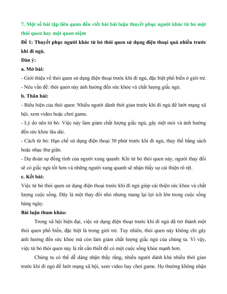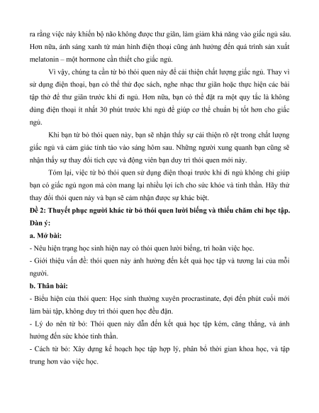 Đề 1: Thuyết phục người khác từ bỏ thói quen sử dụng điện thoại quá nhiều trước khi đi ngủ. Dàn ý: a. Mở bài: