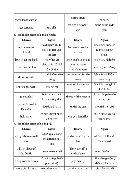 3. Idiom liên quan đến thiên nhiên Idioms Nghĩa Idioms Nghĩa một người chỉ là cứ để mọi thứ diễn a fair-weather let nature take its bạn khi mọi việc ra một cách tự friend course tốt đẹp nhiên beat about the bush nói vòng vo once in a blue moon họa hoằn, rất hiếm chắc chắn, dù thế over the moon come rain or shine vô cùng vui sướng nào đi nữa = on cloud nine