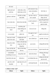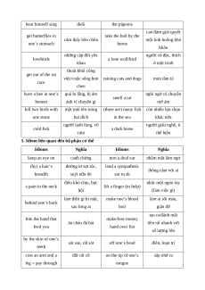 5. Idiom liên quan đến bộ phận cơ thể Idioms Nghĩa Idioms Nghĩa keep an eye on canh chừng turn a deaf ear nhắm mắt làm ngơ (by) a hair’s đường tơ sợi tóc, lend a sympathetic thông cảm với ai breadth suýt nữa thì ear to sb điều khó chịu, bực nhấc một ngón tay a pain in the neck lift a finger (to help) bội (làm việc gì) làm điều gì bí mật, make one’s blood làm ai sôi máu, behind one’s back sau lưng ai boil giận dữ tạo ra/đánh mất bite the hand that make/lose money ăn cháo đá bát tiền rất nhanh với feed you hand over fist số lượng lớn by the skin of one’s sát sao, rất sát off one’s head điên, loạn trí teeth cost an arm and a đắt cắt cổ on the tip of one’s sắp nhớ ra leg = pay through tongue the nose pull someone’s leg fight tooth and chiến đấu ác liệt, = play tricks/jokes trêu chọc ai nail/claw đánh nhau ác liệt on mất hết can đảm, put one’s foot in lỡ mồm nói điều gì get/have cold feet chùn bước one’s mouth đáng xấu hổ giúp đỡ người khác scratch someone’s have itchy feet thích đi du lịch đây với hy vọng họ sẽ back giúp lại mình nói điều gì đó hit the nail on the chuẩn không cần see eye to eye đồng tình head chỉnh the apple of one’s in two minds phân vân người mà mình yêu eye keep one’s head cố gắng một cách turn a blind eye giả điếc, làm ngơ above the water khó khăn khiến ai đó phải tập keep sb on their trung vào việc họ up in arms chống đối kịch liệt toes đang làm know sth like the nắm rõ như lòng up to my ears/eyes bận tối mắt tối mũi back of one’s hand bàn tay in the blink/ để bụng, để trong trong nháy mắt take sth to heart twinkling of an eye lòng miệng còn hôi sữa, lead sb by the nose dắt mũi ai wet behind the ears quá non nớt give sb a cold lạnh nhạt với ai, lờ with bated breath nín thở, hồi hộp shoulder đi