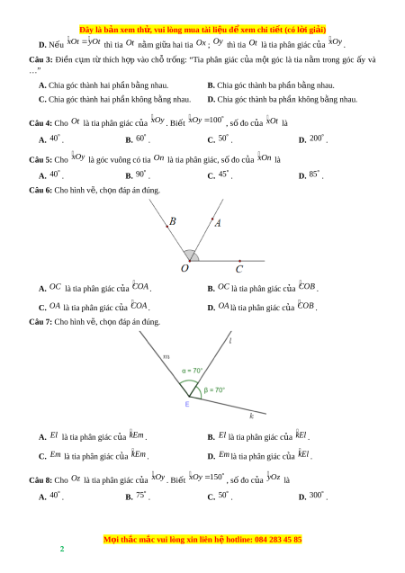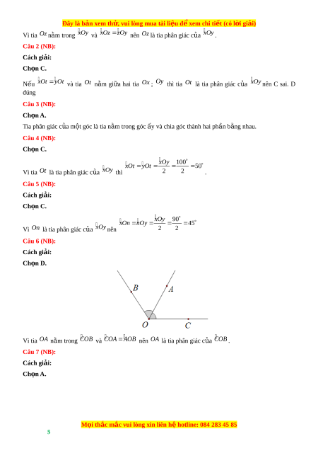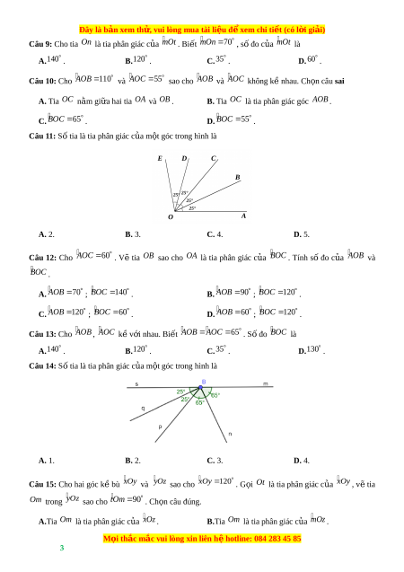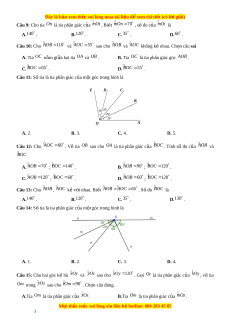 B. Tia OC la tia phân giac goc AOB . C. BOC 6 5 . D. BOC 5 5 . Câu 11: S t ố ia la tia phân giac c a u m t ô goc trong hinh la A. 2. B. 3. C. 4. D. 5.