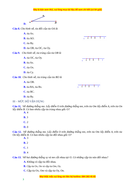 Câu 10. Cho hình v , t ẽ ia trùng c a ủ tia BO là A. tia OB. B. tia BA, tia Bx. C. tia BC. D. tia By. III – M C Đ Ứ Ộ V N Ậ D N Ụ G
