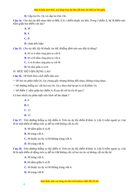 Câu 18. Trên đư ng ờ th ng ẳ xy l y ấ đi m ể A. Trên tia Ay l y ấ đi m ể B khác A. L y ấ O n m ằ ngoài xy. G i ọ M là m t ộ đi m ể di đ ng t ộ rên xy đ t ể ia OM không c t ắ c hai ả tia Ax và không c t ắ tia By thì A. M trùng v i ớ A B. M nằm gi a ữ A và B C. M thu c